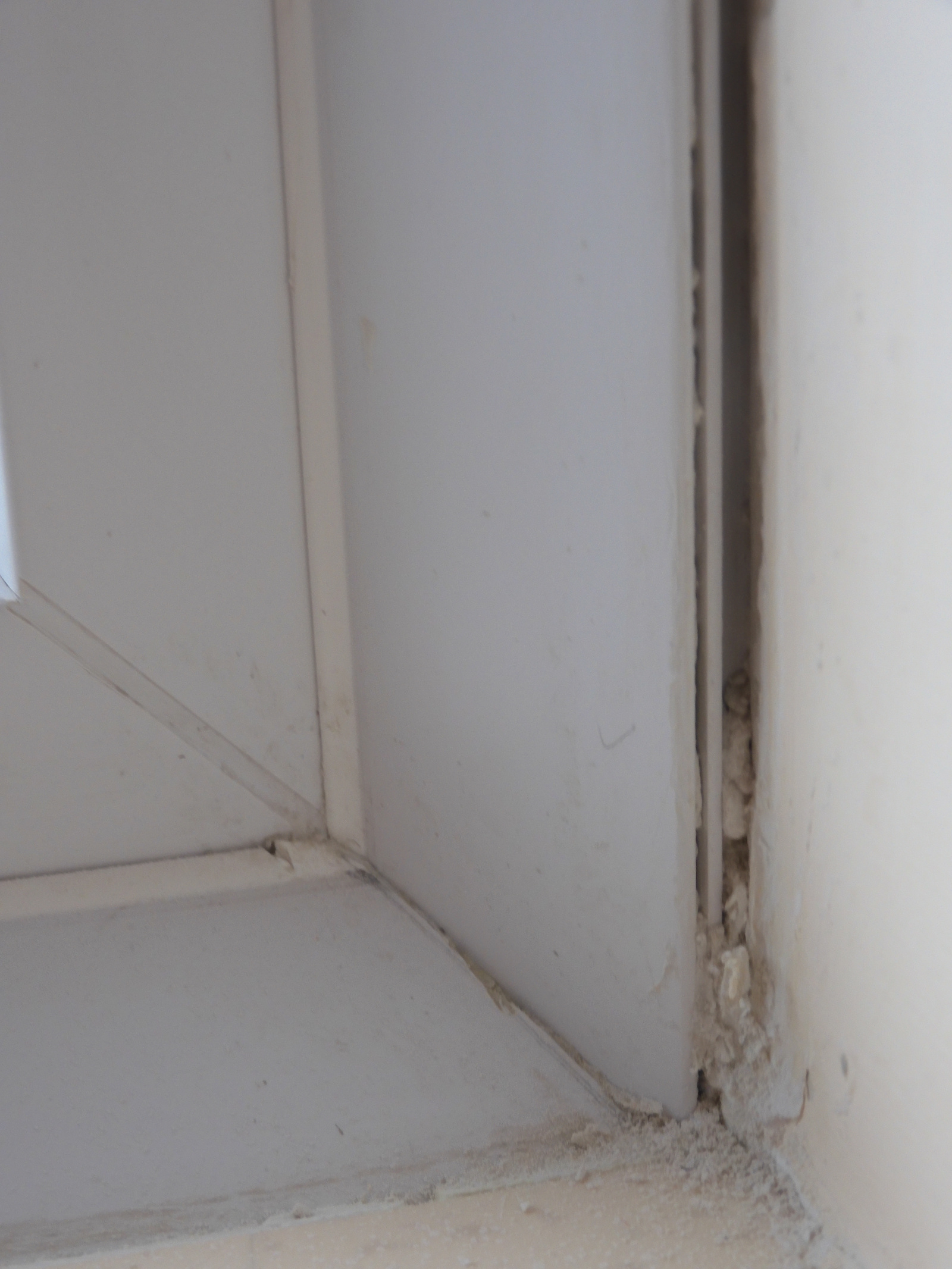 Seems to be a frame set in the wall and the diagonal trim overThere is plastic at the back of the gap set into the wall. Filled then siliconed over to make it compatible with the whole.I stand to be corrected as I have no idea how these windows are set.Brick wall and dry wall.I have fine filler (basic), general filler as in Bartone cheap? Or do I need something special?Is it just Frame Sealant over? I have some of that.Muchas gracias.