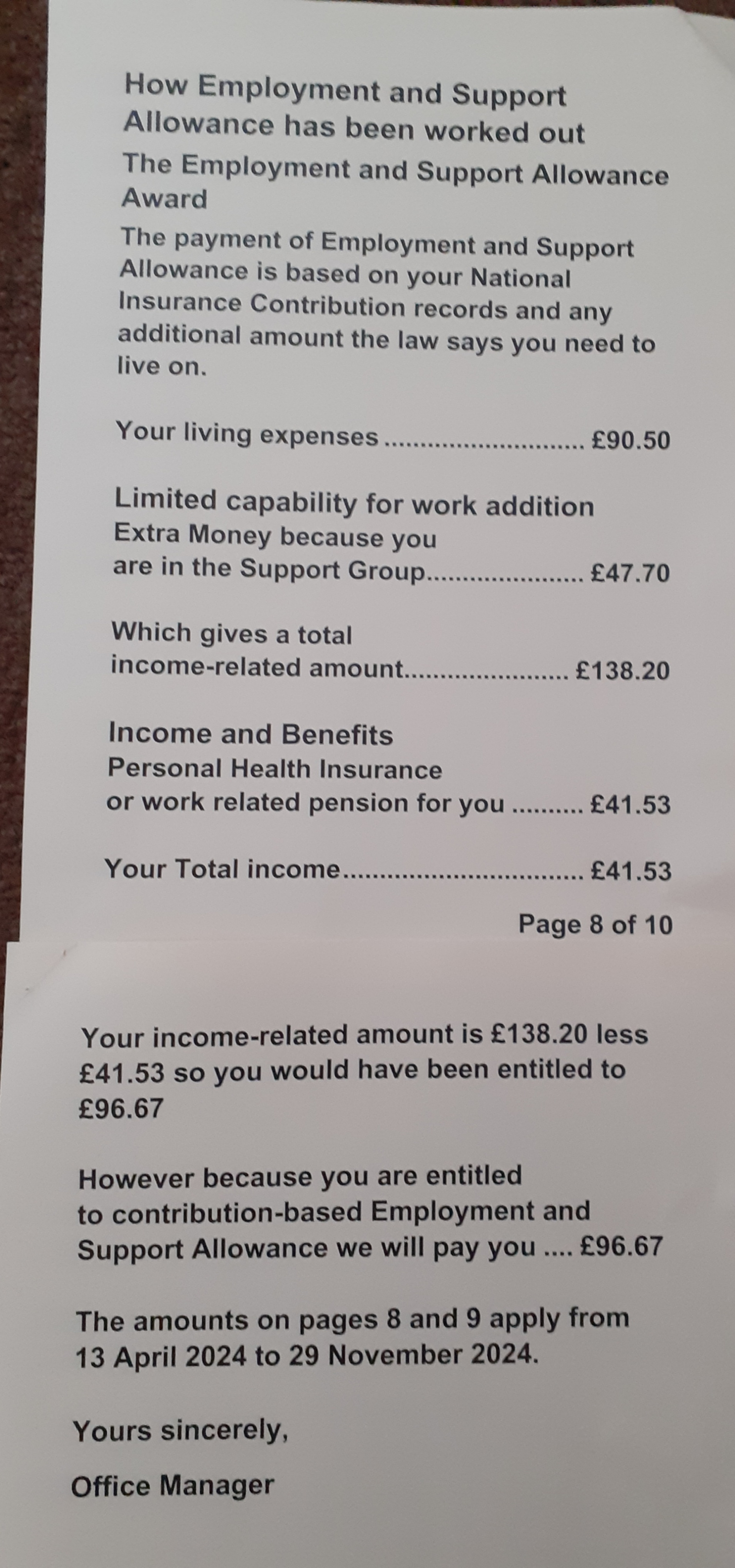 My latest award letter. My occupational pension was £728.29 each month for last financial year, hence the deduction. I haven't yet had this years' figure from my pension provider.