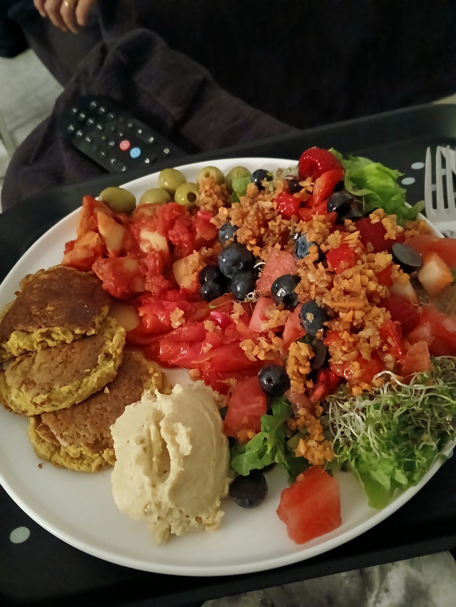 Falafel, hommous, olives stuffed with lemon, roasted peppers, patas bravas, salad leaves (from the garden), strawberries, raspberries, blueberries, pomegranate, watermelon, broccoli sprouts, black grape, carrot and apple 'rice' and balsamic - absolutely lush but it may mean that I have to roll up the stairs tonight!! 🙄😂