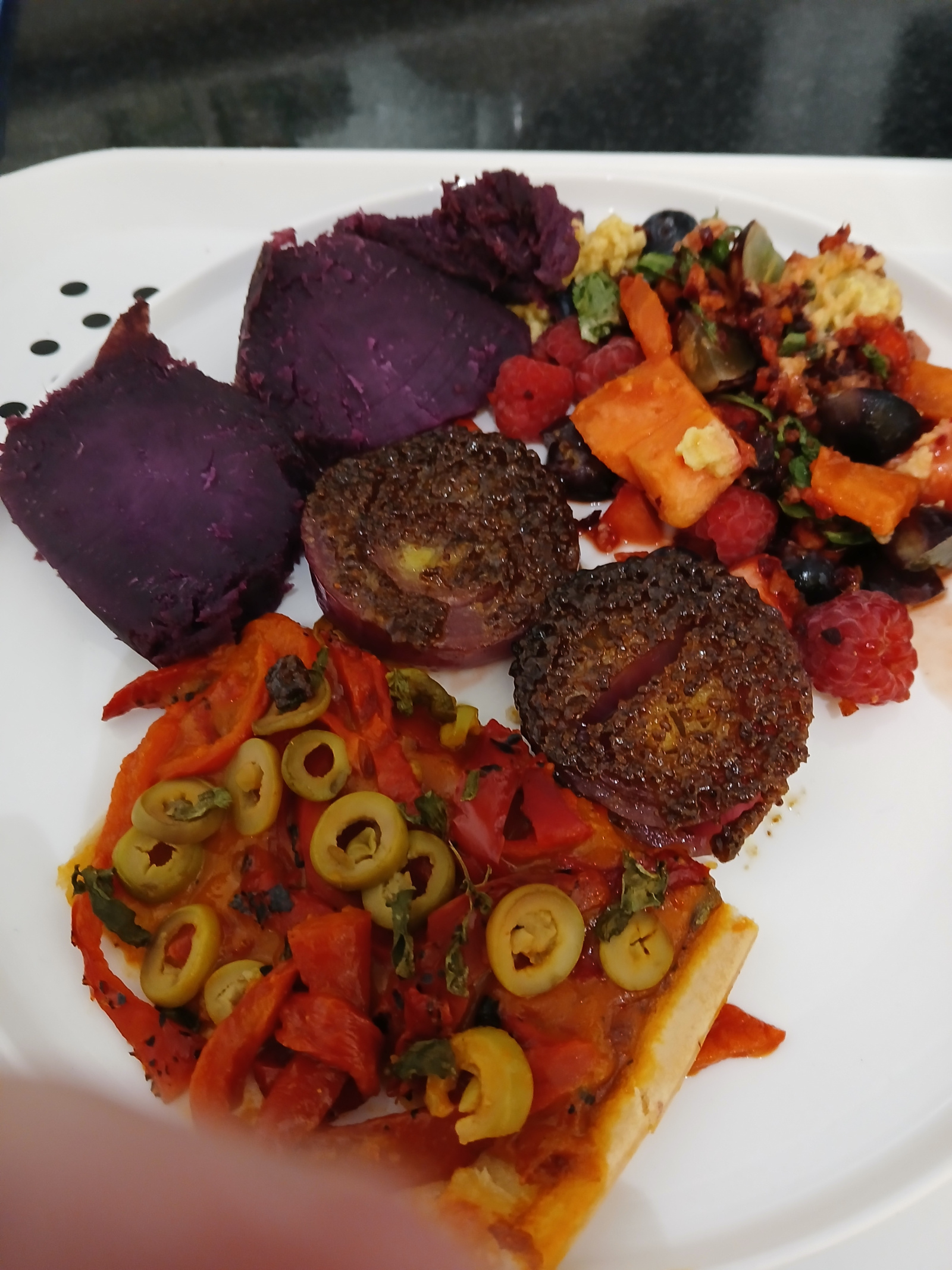 Mediterranean tarts, purple sweet potatoes, roasted red onion steaks and my usual salad for dinner 😋