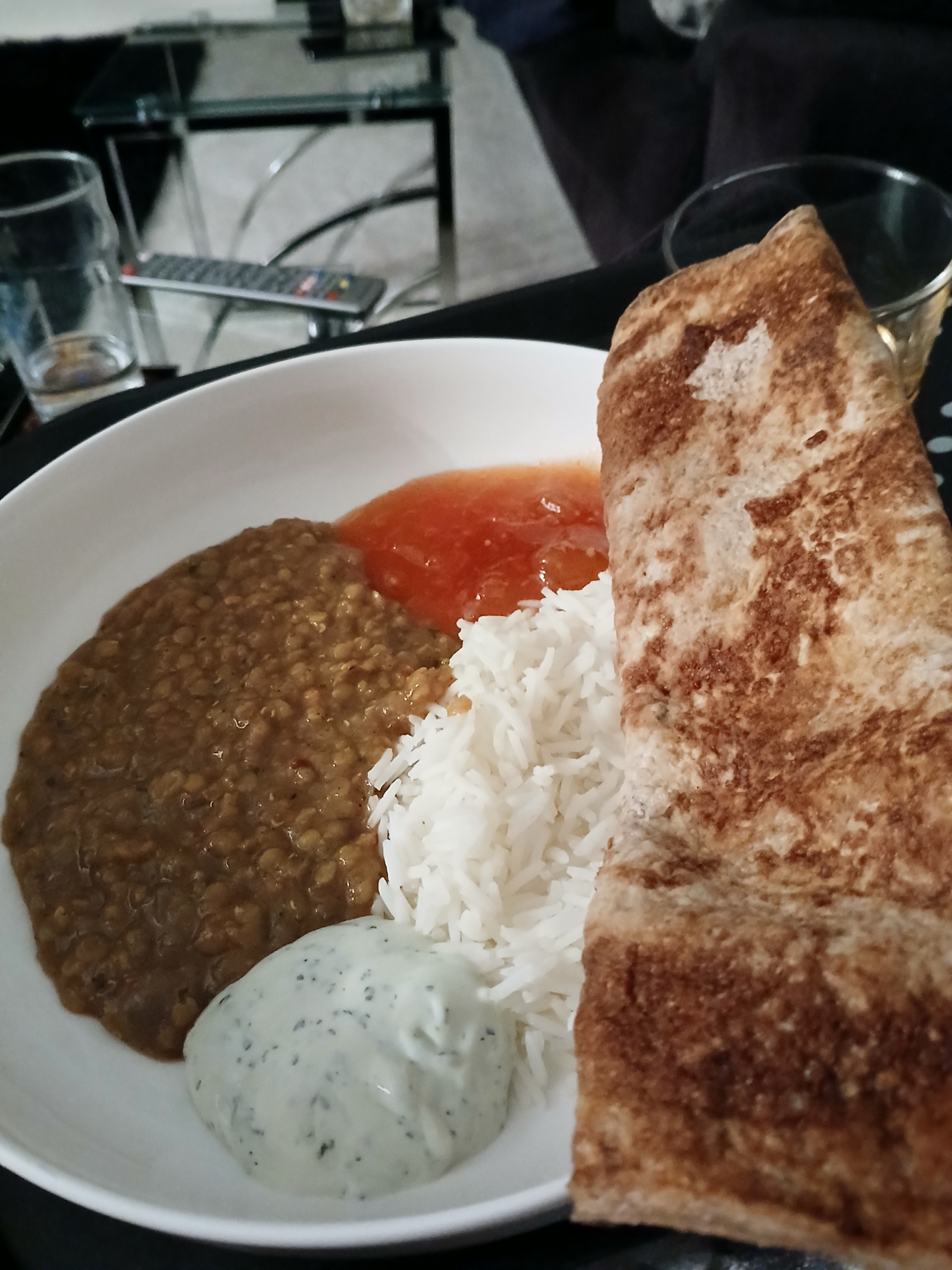 Dinner last night was an easy and quick one - ethiopian lentils with basmati rice, sourdough pancake, yoghurt and mint and mango chutney 😁