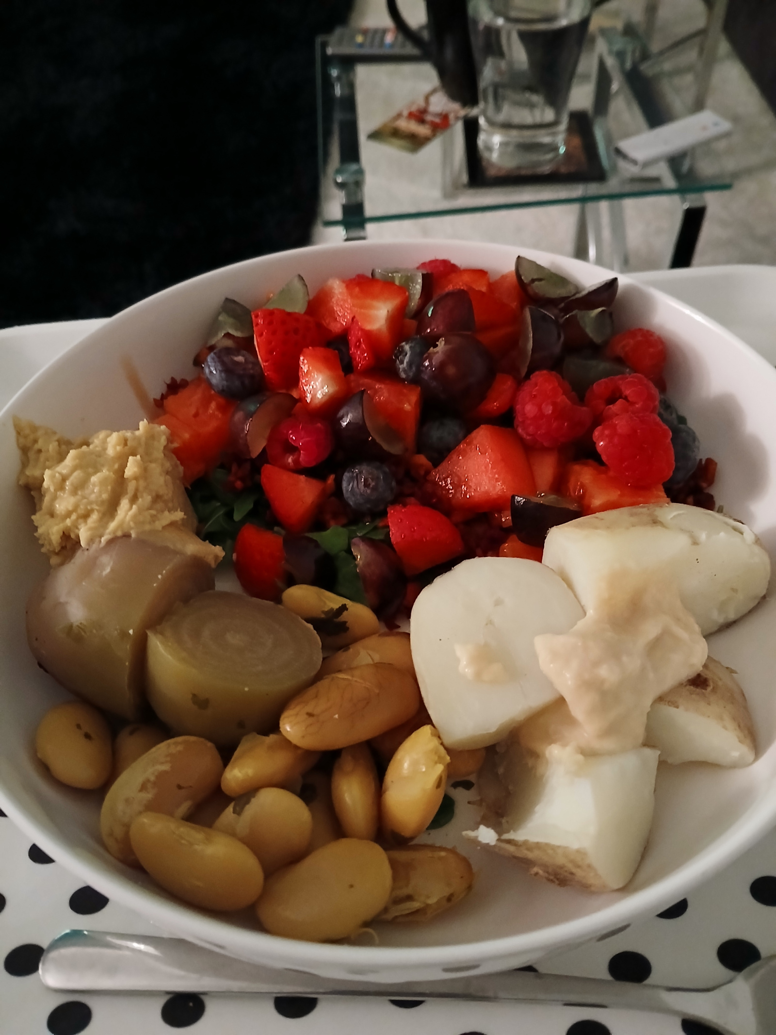 Raided the fridge instead and had steamed beetroot, new potatoes with horseradish sauce, butter beans, rocket, blueberries, strawberries, raspberries, black grapes, papaya, hommous and blood orange balsamic 😋 I'll do the tarts tomorrow 😁