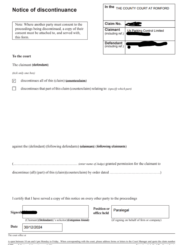 Our client has instructed us to discontinue Court proceedings and close our file. Therefore, please find enclosed the Claimant’s N279 Notice of Discontinuance for your records.