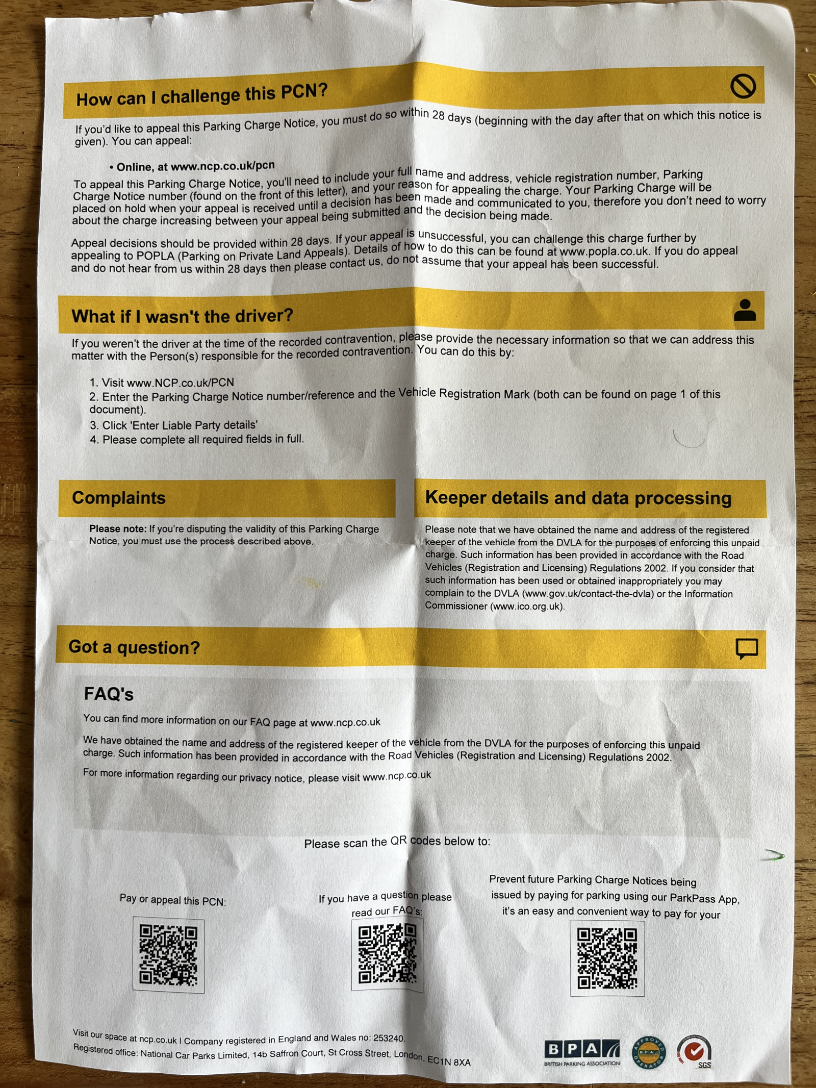 I suppose that as far as appealing it goes, its use a keeper appeal, possibly one that says that NCP failed to comply with POFA, but without revealing who was driving. NCP will reject it anyway and issue a Popla code