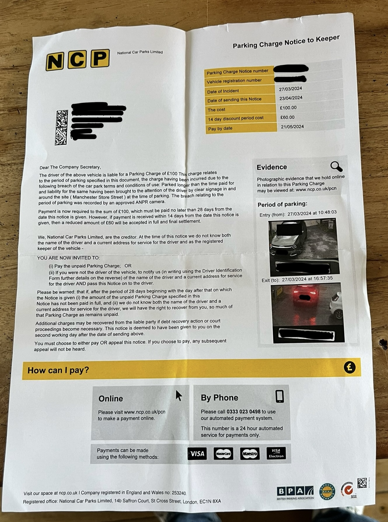 The NTK includes ANPR camera footage and was dated 27 days after the alleged overstay (received 30 days after).