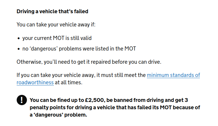 metropolis090 said:A small heads-up for anyone reading: if you go in early and get a fail, it stays in the system and you’re not supposed to drive until it’s fixed, especially if the issues are major or dangerous. I first did a pre-check at MB MOTORS (kind of like a pre-MOT), they pointed out small things (bulb, wiper), and only then I went through with the actual test.The caveat to that is if they find something dangerous and inform you.It's not relevant to the MOT, but driving it would be an offence (if caught).0