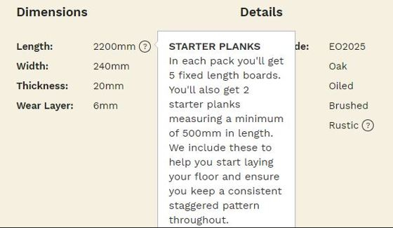 We recently had a delivery to the value of several thousands for some oak engineered flooring. The narrative on the website stated: "In each pack you will get 5 fixed length boards. You'll also get 2 starter planks measuring a minimum of 500mm in length. We include these to help you start laying your floor and to ensure you keep a consistent staggered pattern throughout." We drew up layouts for several rooms in a cad program based on the information provided. We assumed we would have 5 full length boards at 2200mm. This was not the case. Each pack actually had 4 full length boards and two short boards.