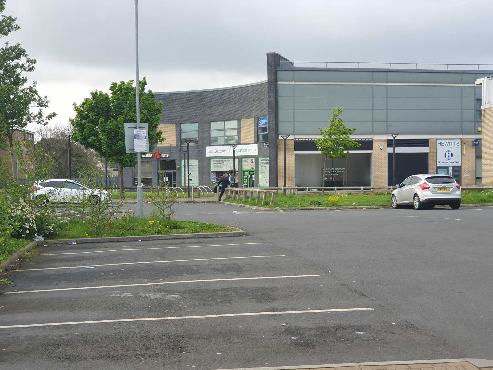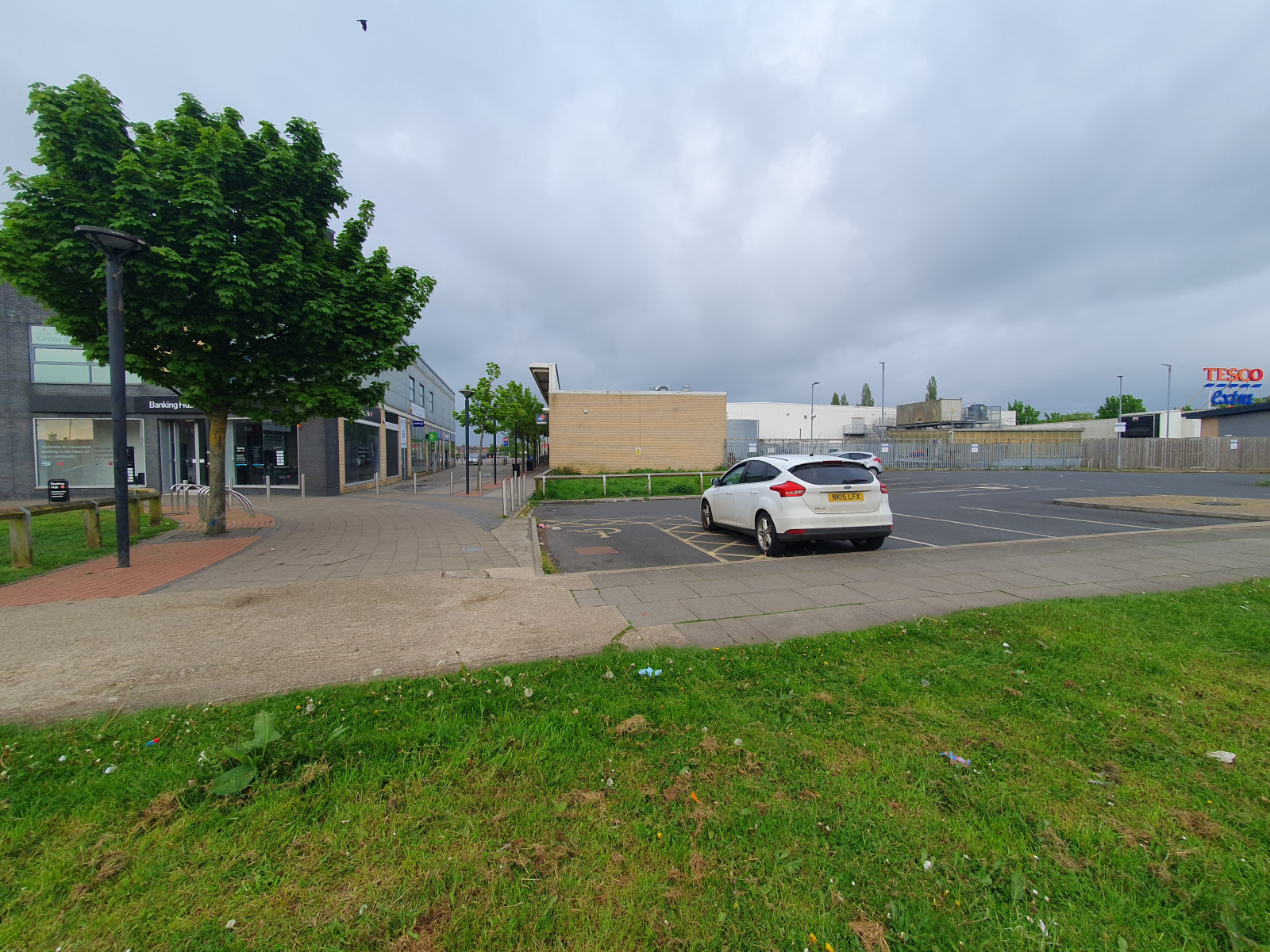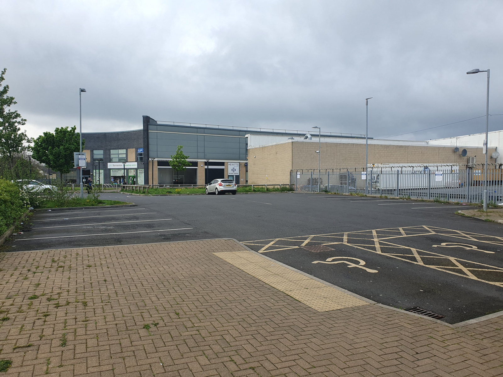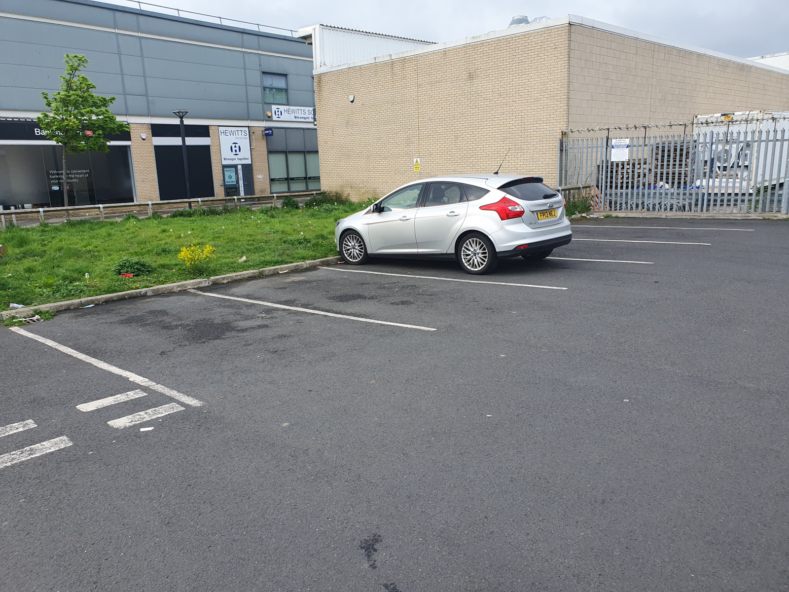 Oh and a shot from way over towards Costa. To give more of a picture of the full layout as there are bays marked in front of the metal fence and opposite it. First sign appears at metal fence edge, final sign fixed to the post behind entry sign, some more signs out of shot to my right in the corner. I take it this first sign is meant to apply to all bays where the silver car is parked and the bays where the Domino driver is.