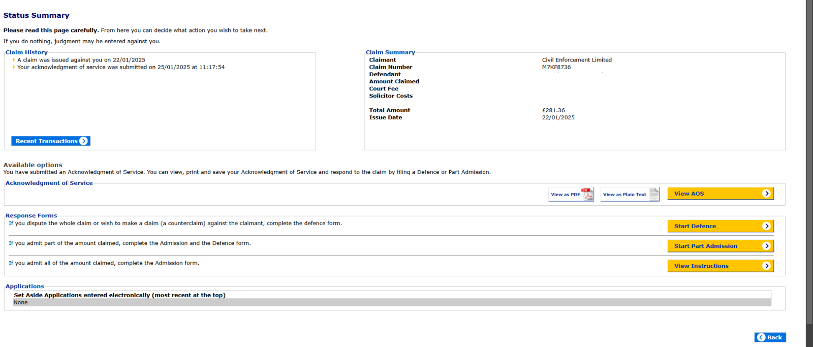 "Have just submitted my Money Claim dispute and received the response pack PDF with the only box ticked as 'I intend to defend all of this claim' " Is that Not AOS? Acknowledgment of service is stated on the PDF.0
