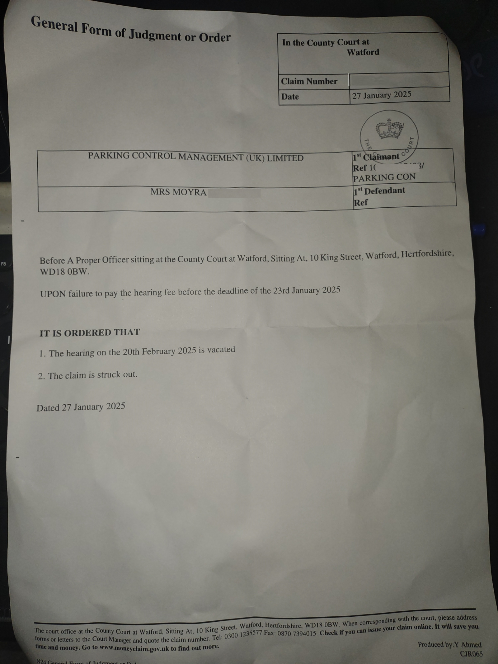Another update. Received the hefty 42 page document pack from gladstones and ironically a separate letter from the court, on the same day, stating that the Claimant failed to pay the Court Hearing fee . Thus the claim has been struck out