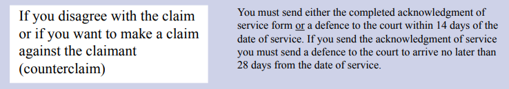 If you send an acknowledgment of service you must send a defence to the court to arrive no later than 28 days from the date of service.