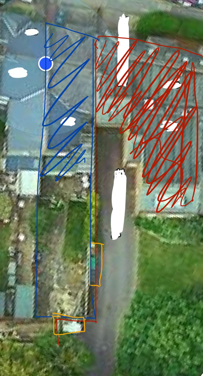 Bkue is my boundary, which is fence. Red is owned by the freeholder. Red shaded is freeholder owned, leased flats. Orange is where their bins are. Road goes under the flat adjoining our property, but is privately owned.