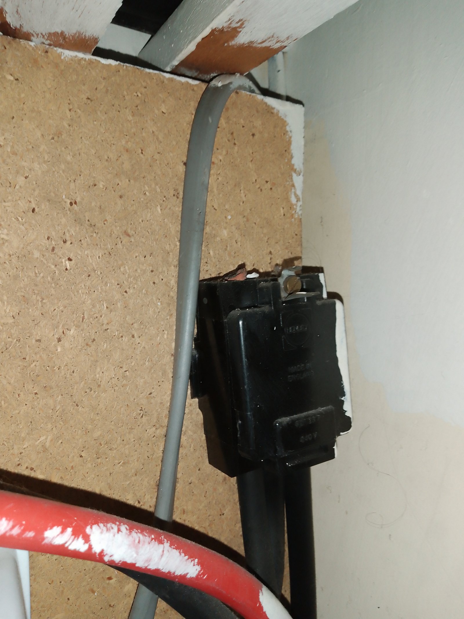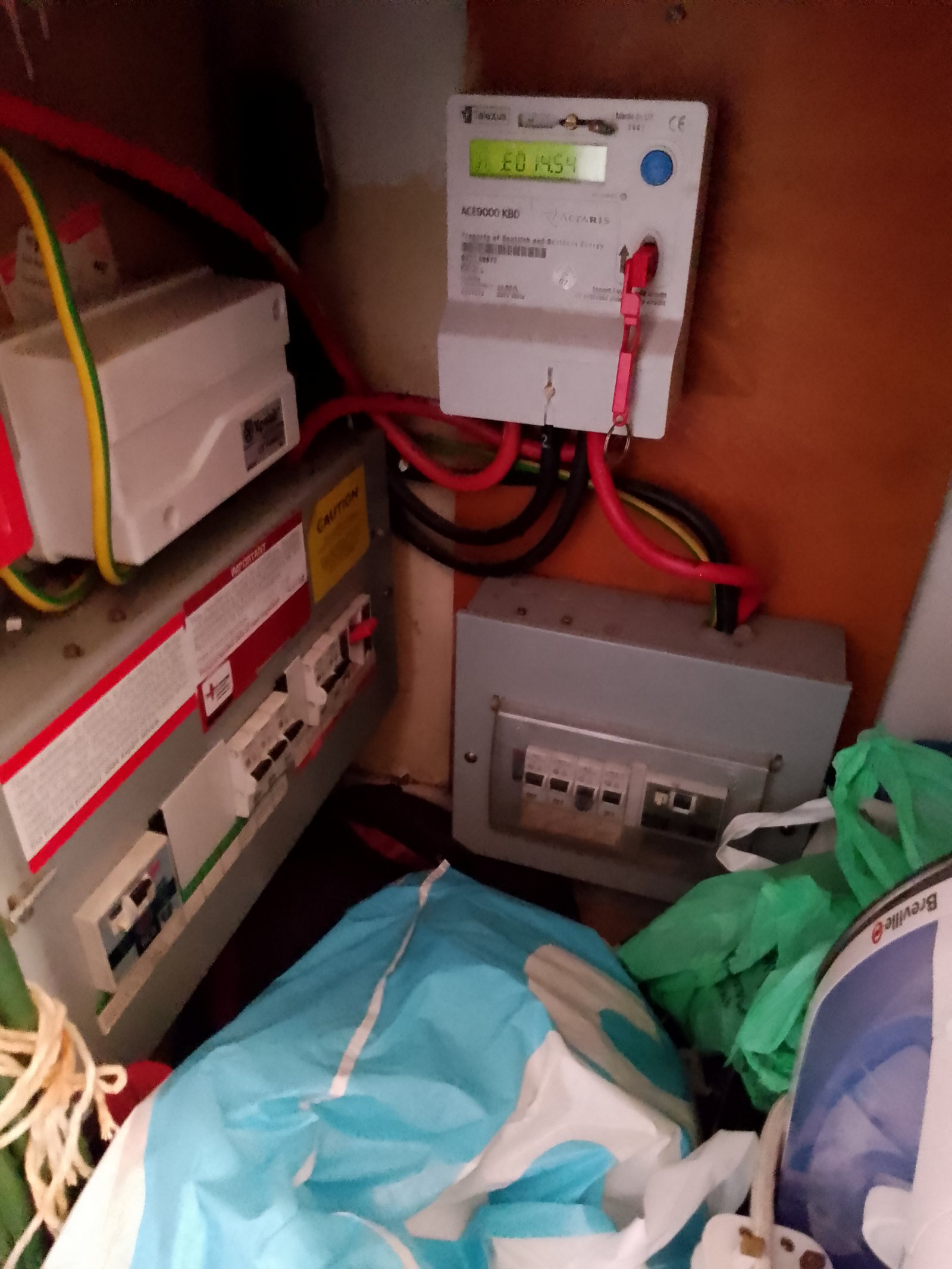 RH black cable from meter goes to small black box on wall in corner, which has 2 other black cables, 1 which leads to large grey peak unit, the other to small grey off-peak unit below meter. Pic below of black box.