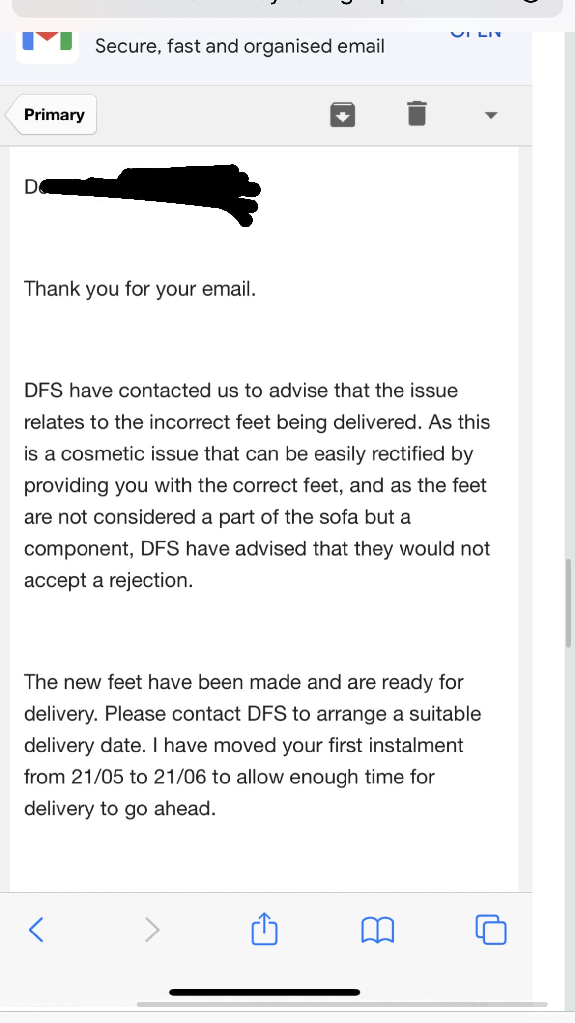 Hi I have recently posted before regarding a sofa I bought from dfs . They sent me the sofa with the wrong colour feet I picked therefore I am within my right to request a refund within 30 days under the consumer act 2015 as the item “is not as described “ they are trying to argue with me that the feet are “ components “ “aesthetic” therefore I ain’t entitled to a refund . I have attached my letter and also the response from the finance company . Any advice on the next steps please