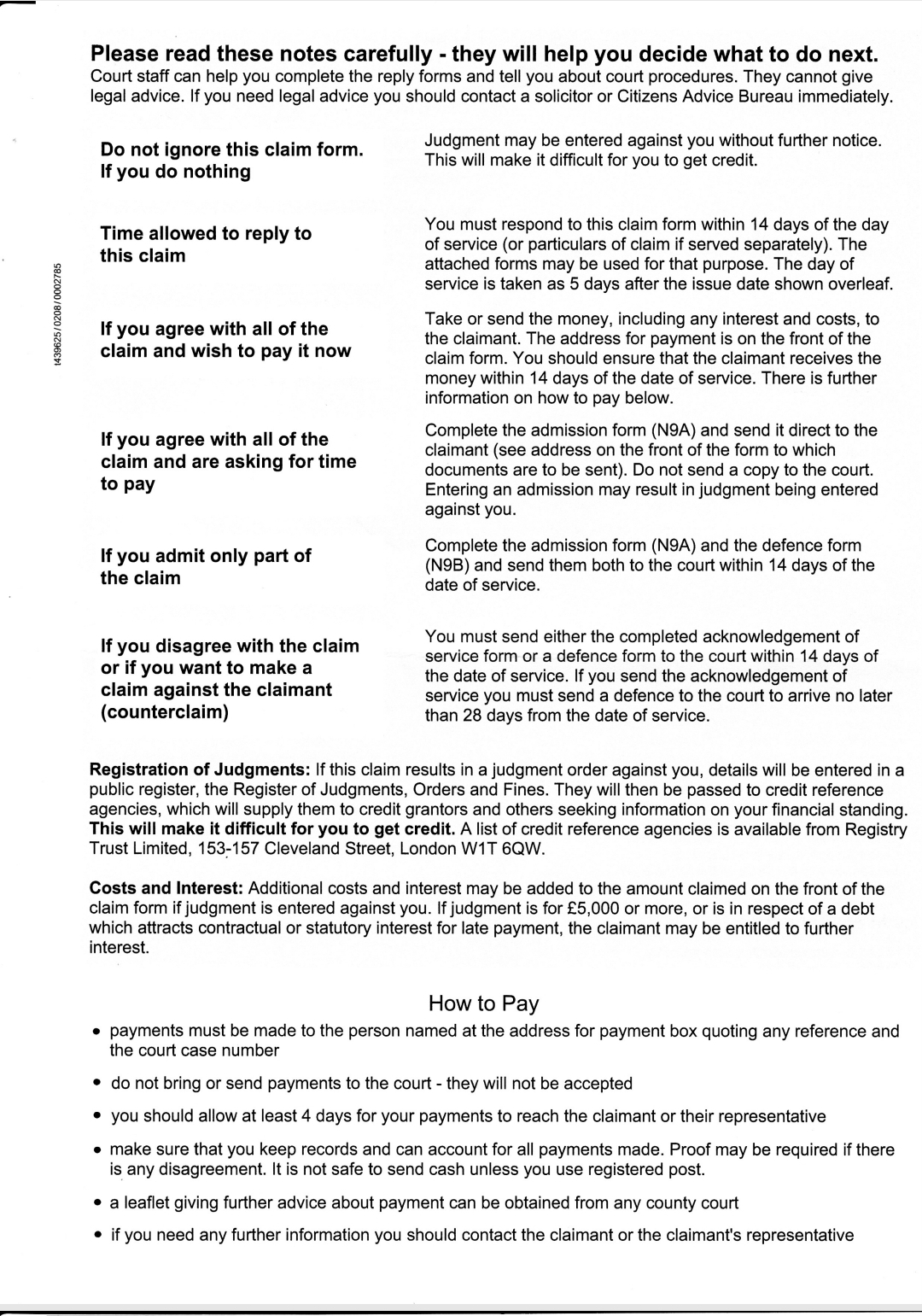 I don't think anyone mentioned 30 days to respond to a Claim, did they?fineclaret said:I have 14 days from 8th July to acknowledge service, another 14 (not 30 total as has been mentioned) to send defence.