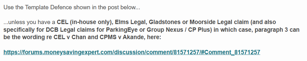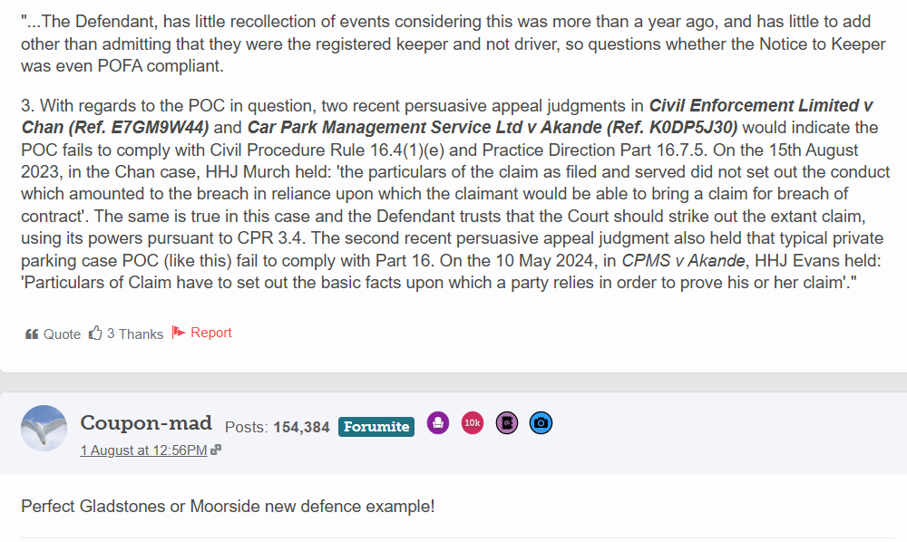 But I think it's clear and obvious anyway when reading that thread. It's linked twice.1. The Claimant’s sparse case lacks specificity and does not comply with CPR 16.4, 16PD3 or 16PD7, failing to 'state all facts necessary for the purpose of formulating a complete cause of action'. The added costs/damages are an attempt at double recovery of capped legal fees (already listed in the claim) and are not monies genuinely owed to, or incurred by, this Claimant. The claim also exceeds the Code of Practice (CoP) £100 parking charge ('PC') maximum. Exaggerated claims for impermissible sums are good reason for the court to intervene. Whilst the Defendant reserves the right to amend the defence if details of the contract are provided, the court is invited to strike out the claim using its powers under CPR 3.4.