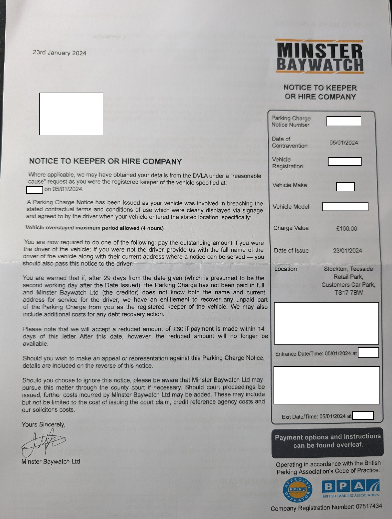 Why do you believe that? Without either telling us or showing us the NtK, we cannot say whether you are correct or not. What you may need to understand is that the actual day you physically receive the NtK is irrelevant unless you can provide proof.mossmachine said:Short version: Postal PCN from Minster Baywatch (MB) to RK received for an alleged overstay in Teeside Park Stockton on 5th January 2024. Date issued 23rd January. I believe this to be outside the 14 day period for keeper liability (POFA section 9 para 5). Apart from that the PCN looked POFA compliant. I can post a redacted version if needed.