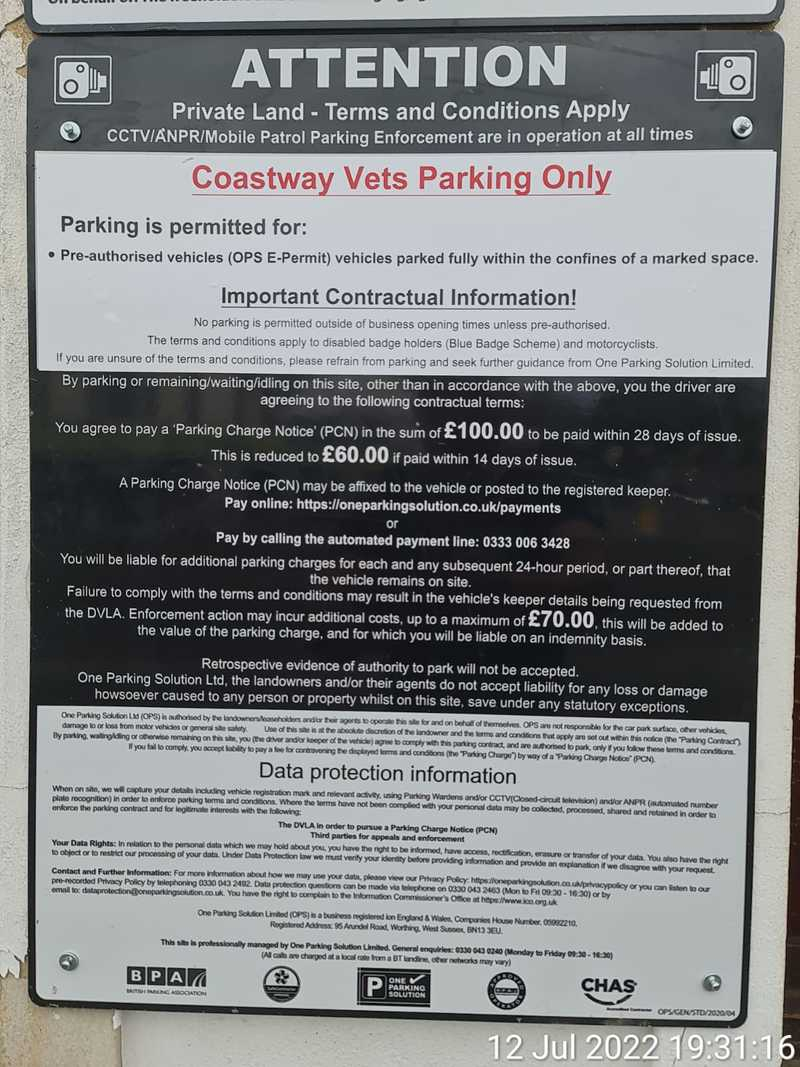 Coupon-mad - interesting point you raise and I have just tried to find some info about overt/covert camera and will look at the DPA 2018. I am including the picture of the small notice on a wall at Coastway Vets which they sent on the emailed PCN. It is a small sign with such tiny writing about data protection / CCTV surveillance.