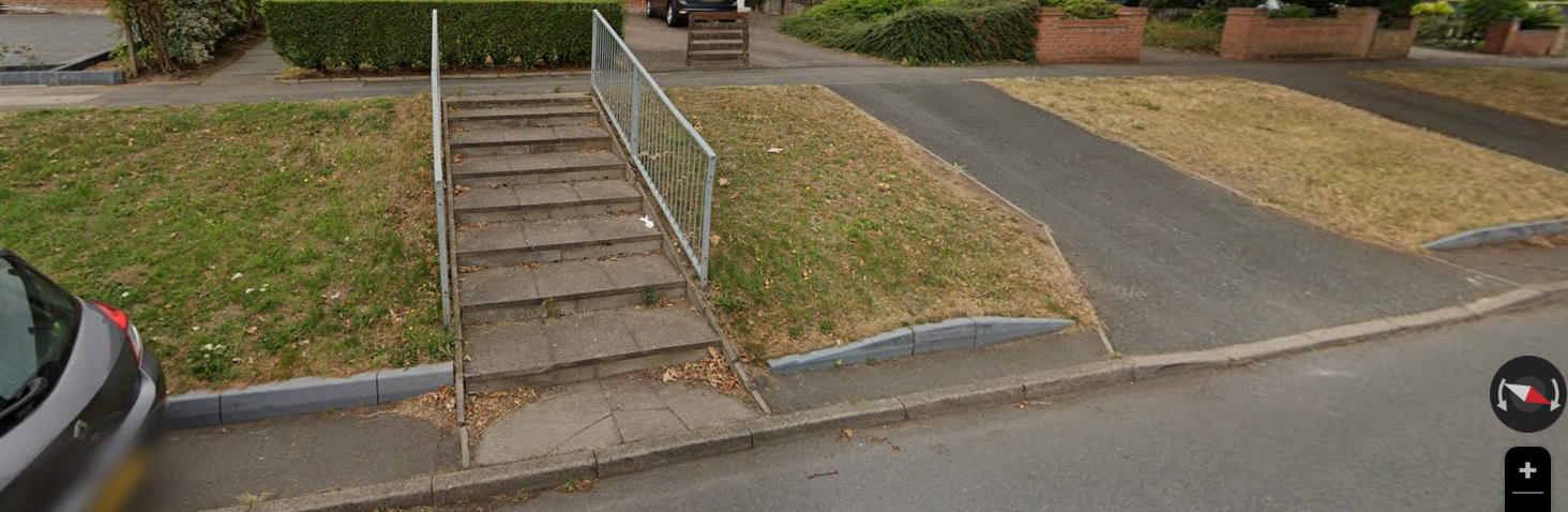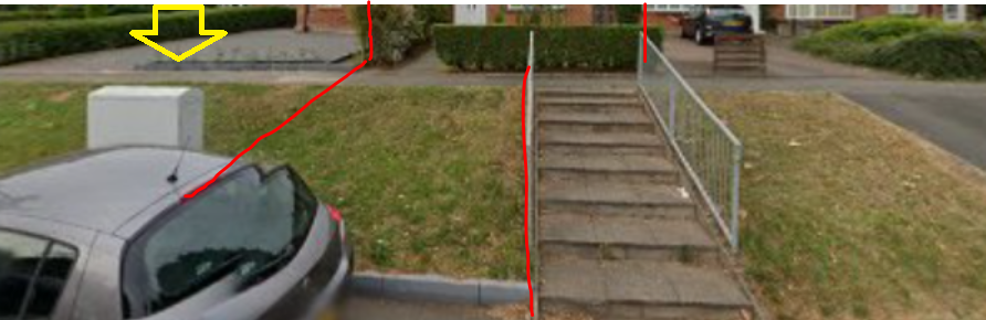 It could be BT/Openreach, or it could be cable. It is also possible it could be for the electricity supply, or the cabinet for controlling the local street lighting. There are also other possibilities - the highway authority would make their own enquiries if you get as far as applying for a crossover.greenpea_8 said:Does anyone have any experience of (i) what this box is?greenpea_8 said:(ii) whether the box and stairwell may need to be moved to make space for the driveway (and is this expensive?)Probably (almost certainly) "yes" and "yes". Getting a crossover put in here won't be cheap for several reasons.Is the car on the left parked in some kind of layby or parking space? The grass and the driveway to the right of the picture appear to extend out further towards the camera position - so the driveway on the right is at a slightly less steep slope than the one for your prospective property would be. It is hard to tell from the pictures, but I think the slope up where you've indicated with the red lines is probably too steep to be safely used. If there is a layby or similar then that may need to be filled in to allow for a shallower sloped driveway.greenpea_8 said:and (iii) any advice on how to approach this issue?Usually you start by asking the council's highway department to provide you with a quote - firstly they ask you to pay them some money, then they will do a survey. Usually you have to own the property first.Assuming the council are willing to agree to the crossover, I'd expect the costs for this one to be far more than typical. I would probably budget at least £20k, but it could be a lot more depending on what that cabinet is for.1 -