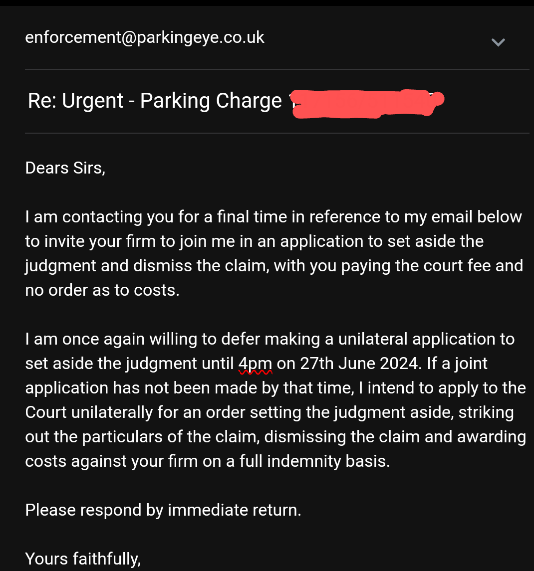 No, surely not! What does that even mean? Are you standing outside with your arms upraised. Don't you mean "contacting you for (what I hope will be) the final time"?Stressed_Out_VG said:I am reaching out for the final time to invite the Claimant to join with me in an application to set aside the judgment and dismiss the claim, with the Claimant paying the court fee and no order as to costs.