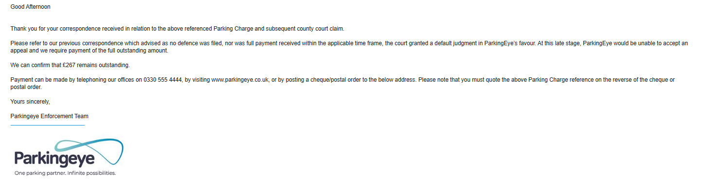 Just to remind you that THIS is what you need to be covering at your application hearing (this half hour is not your defence to the PCN).Johnersh said:this instance, 4 letters were issued prior to legal action but unfortunately, ParkingEye received no response. Our original notices outlined the appeals procedure offered by ParkingEye and provided a period of 28 days from the date of our initial correspondence to send any documentation you believe would aid an appeal to us directly. ParkingEye run a dedicated appeals team who consider each appeal on a case by case basis but we note that in this instance, no such appeal was lodged.ParkingEye thereafter issued a county court claim on 19/02/2024 to recover the outstanding amount.So despite having the clearest of indications that the defendant may not be receiving their communications they press on with court proceedings.