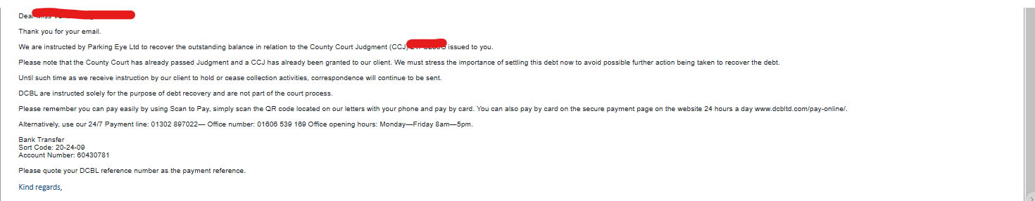 - a copy of the DCB Ltd letter which (to a reasonable person) has 'misled' you about the amount of the CCJ by adding an unsolicited £70 - which isn't a HCEO or bailiff enforcement fee and is completely unsupported by any allowed rules. This despite the fact that the £197 already includes an (already unrecoverable) inflated £20 or £25 admin fee added for no reason, which is on no ParkingEye signs?