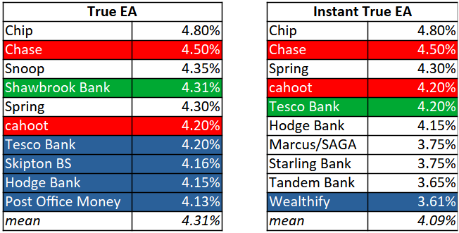 ircE said:True EA entries are easy access savings accounts which can be opened, and pay the headline interest rate, with a minimum balance of no more than £10. These accounts allow unlimited withdrawals. The table includes accounts with time-limited bonus rates and accounts restricted to new customers - but excludes fee-charging accounts, accounts limited to smaller balances, and accounts only available via savings marketplaces. Instant True EA entries are those True EA accounts which advertise immediate deposit and withdrawals 24/7. Highlighted entries show changes since last time: blue for new entries, red for rate reductions, green for rate increases to the respective table.