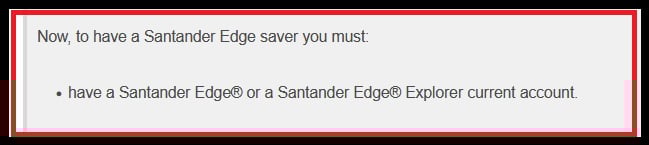 SANTANDER EDGE SAVER ELIGIBILITY CRITERIAWe’ve made changes to the eligibility of your Santander Edge saverWith the launch of our new Santander Edge Explorer current account, we’ve changed the eligibility criteria of our Santander Edge saver. This means that Santander Edge Explorer current account holders can open a Santander Edge saver.This also means that if you choose to upgrade to a Santander Edge Explorer current account, you can keep your Santander Edge saver.We need to tell you about the changes to eligibility for the Santander Edge saver, because if you don’t meet them we might switch your Santander Edge saver to an Everyday Saver.Now, to have a Santander Edge saver you must:- have a Santander Edge® or a Santander Edge® Explorer current account.