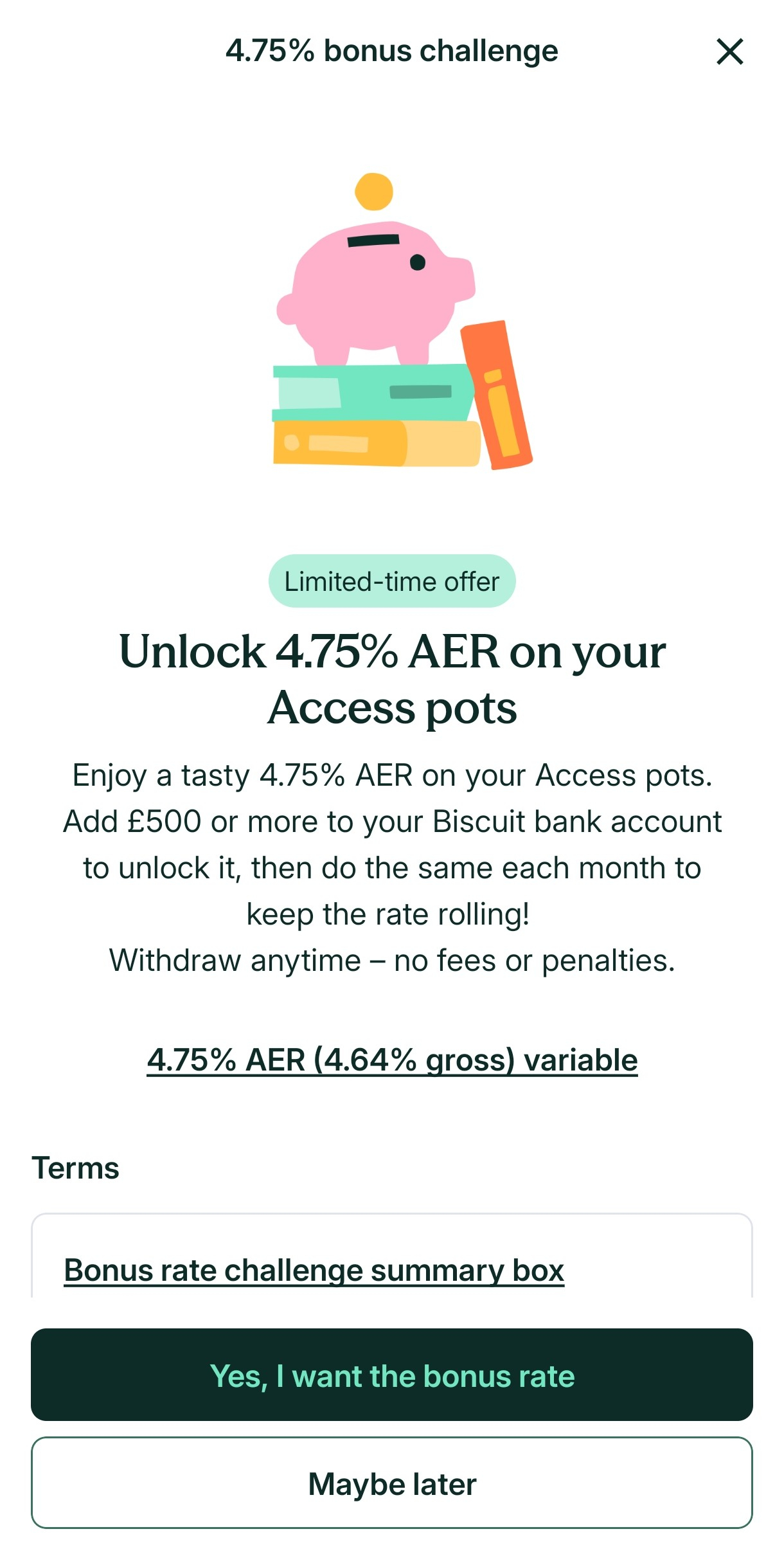 Earn 4.75% AER bonus rate on easy access savingsPay £500+ into your Biscuit bank account each month to unlock an exclusive 4.75% AER* (4.66% gross**) variable on your Access pot savings. Combining our standard 3.25% AER variable with a 1.50% AER fixed bonus, it's yours for up to 12 months.Miss a month? Your rate drops to 3.25% AER variable, but you can unlock the bonus again the next month. Withdraw anytime, so your money stays flexible while it earns more.