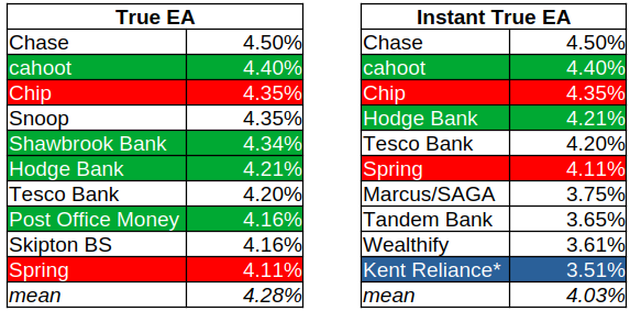 * Kent Reliance is tied with Revolut @ 3.51%, I go by the order on the Moneyfacts website.True EA entries are easy access savings accounts which can be opened, and pay the headline interest rate, with a minimum balance of no more than £10. These accounts allow unlimited withdrawals. The table includes accounts with time-limited bonus rates and accounts restricted to new customers - but excludes fee-charging accounts, accounts limited to smaller balances, and accounts only available via savings marketplaces. Instant True EA entries are those True EA accounts which advertise immediate deposit and withdrawals 24/7. Highlighted entries show changes since last time: blue for new entries, green for rate increases, and red for rate falls.I have excluded Zopa @ 4.75%, the faff associated with it goes against the spirit of True easy access imo.Next base rate decision day is next Thursday 6th.