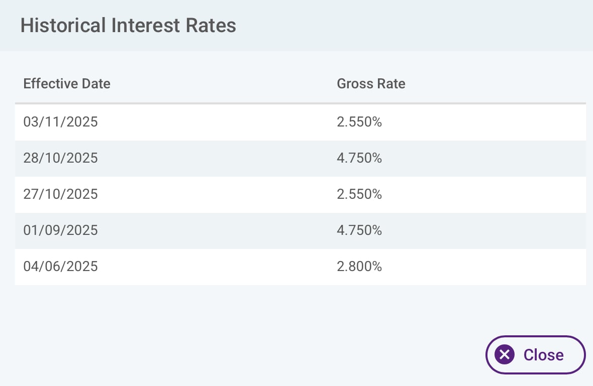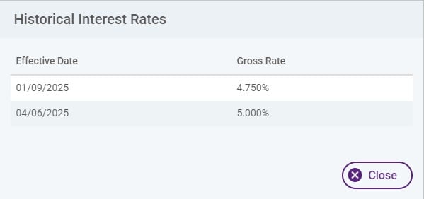 Historical Interest RatesSounds like an issue with yours.Effective Date Gross Rate 01/09/2025 4.750% 09/06/2025 5.000% 05/06/2025 2.800% 1 -