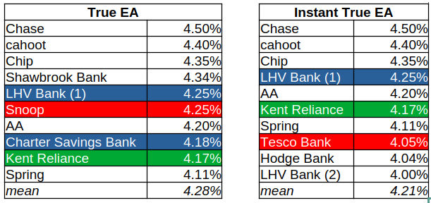 True EA entries are easy access savings accounts that can be opened, and the headline interest rate earned, with a minimum balance of no more than £10. These accounts allow unlimited withdrawals. The table includes accounts that have time-limited bonus rates and accounts restricted to new customers only. The table excludes fee-charging accounts, accounts limited to smaller balances, and accounts only available via savings marketplaces. Instant True EA entries are those True EA entries which advertise immediate deposit and withdrawal times 24/7. Highlighted entries show changes since last time: blue for new entries, green for rate increases, red for rate reductions in the respective table.LHV (1) indicates the savings account, different to the current account (2). Despite KR and Charter's rate increases, Tesco's decision to drop its rate usually portends a BR cut.Next BR decision day is next Thursday 18th.This is the last scorecard of the year - and possibly ever. I'm trying to take a break from this stuff at least over the holidays, possibly into next year as well, not sure yet. Merry Christmas.4 -