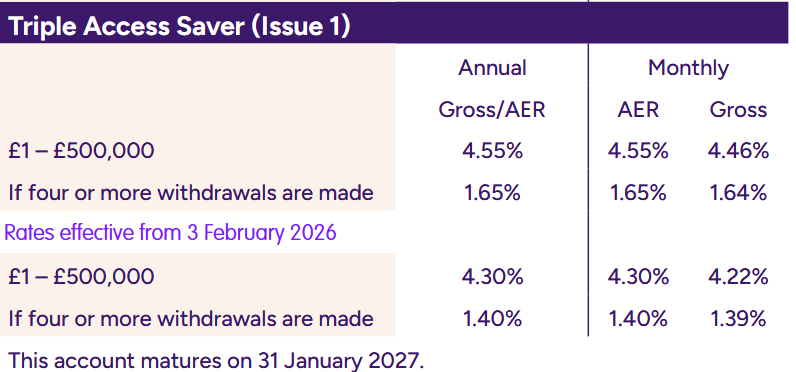 West Brom triple access saver (issue 1) no longer available reducing from 4.55% AER to 4.3% AER (if up to 3 withdrawals made) on 3rd February 2026