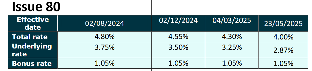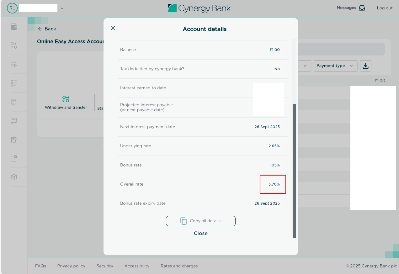 Coincidently received an email today from Cynergy reminding me of bonus ending on EA Iss 80 on 26/09. Thumbs up there, .... but they mentioned it was dropping from 3.7% to 2.65% as per T&C's. That's all OK except I thought I was getting 4.00% at the moment! Good job I took a fat wodge out back in December 2024 and left only £1 in when the rate ceased to be attractive!0