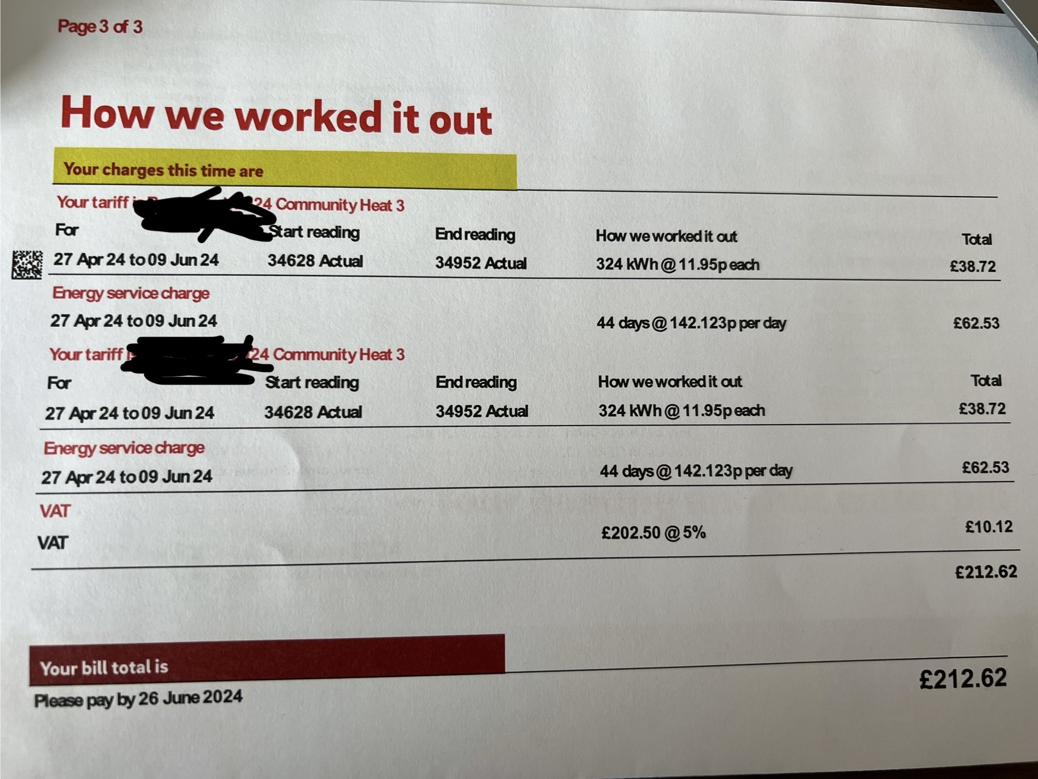 Looking at the bill they've sent, unless I'm missing something painfully obvious, I'm fairly certain they have double charged us for the same period of heating/hot water (actual usage and service charge). The bill literally has the same lines featured twice, which are then both used to come to our total bill of £212.62.