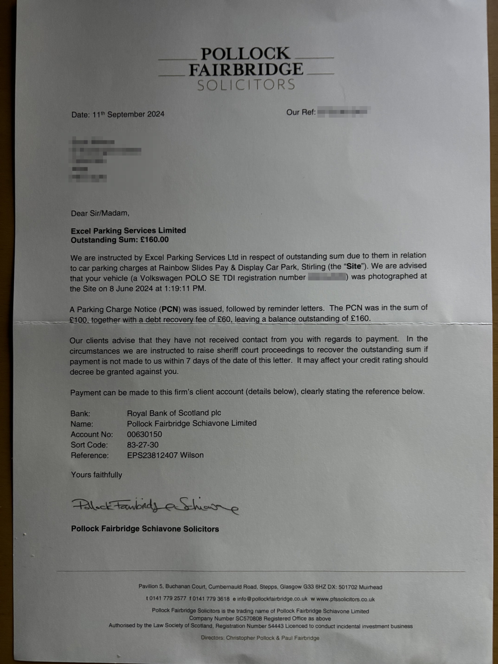 Hey guys, searched a few of the other threads and not sure where I stand. Got a letter from Pollock Fairbridge stating they will 'raise sherrif court proceedings to recover the outstanding sum'. As I understand it this it more a debt collection ? assume I should still ignore. Appreciate your input here. Thanks.0