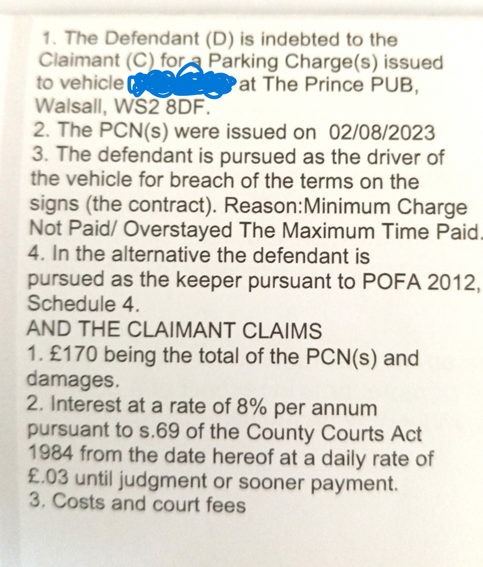 3.1. The defendant’s car was on the premises of the Prince’s pub, Stafford Street, WS2 8DF in Walsall, on Wednesday 2nd of August 2023 at 5:05 pm.