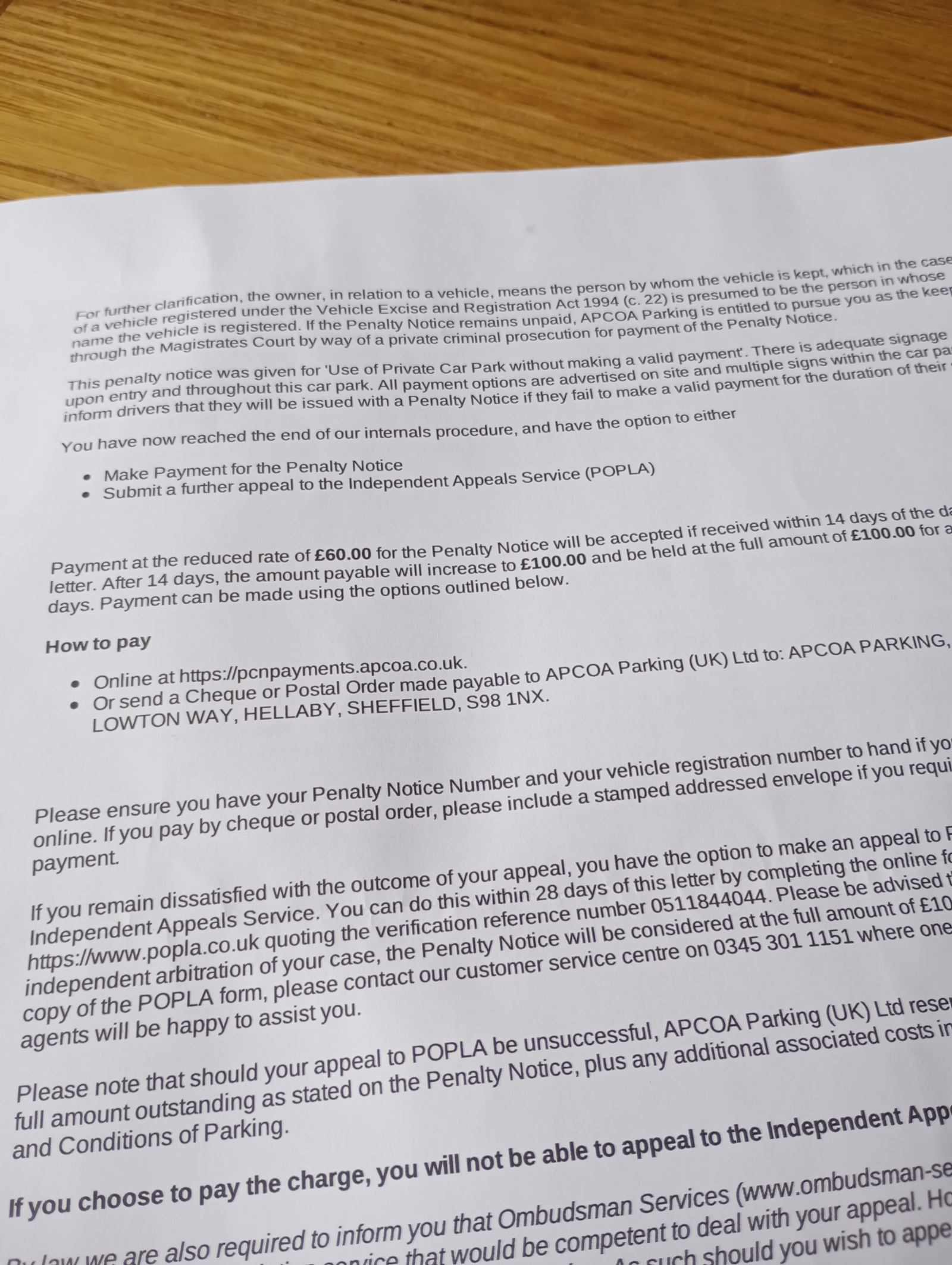 Do you mean that you are not going to point out to PoPLA those points that APCOA have ignored?nuoretrapparit said:Just to update for anyone in the same position - I am at the operator comment stage of the POPLA appeal.I appealed on various grounds, some of which APCOA have effectively countered with evidence (landowner permission, for example) but most of which have been essentially ignored in the comment stage, particular the owner/keeper ground. We'll see what happens but I'm prepared to just wait it out.