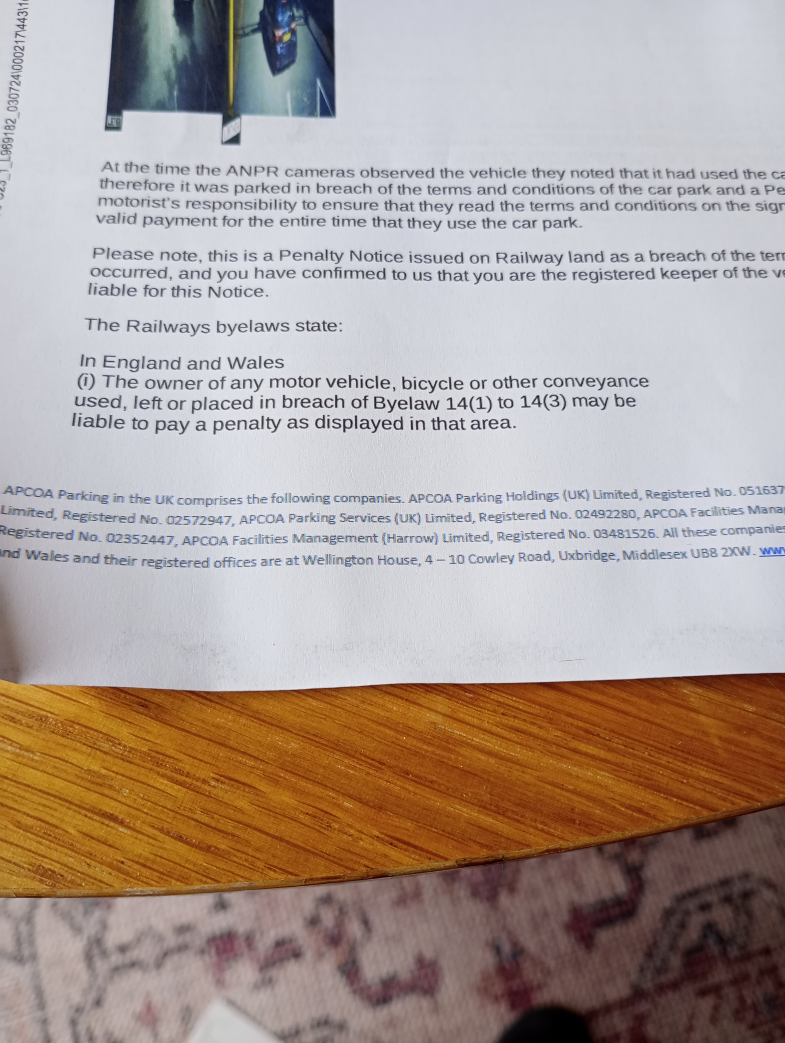 Ps - one area they appear to have dealt with is the landowner authority, they have supplied a contract with the railway operator including a clause giving APCOA the right to pursue in court. Does anyone know of any points I can raise to contradict this?0