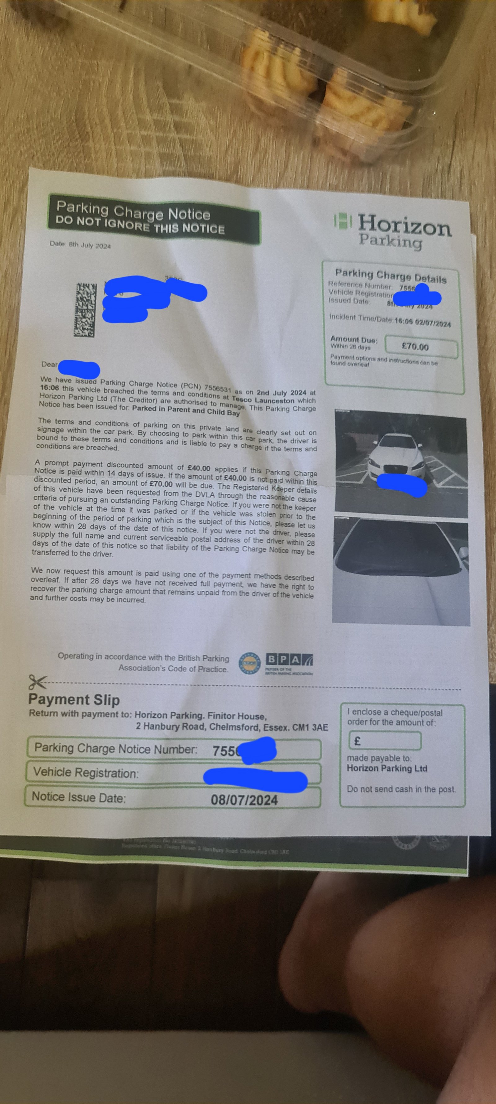 I dealt with one of these earlier this year. Same scenario - parking in a parent and child bay at Tesco without a child.