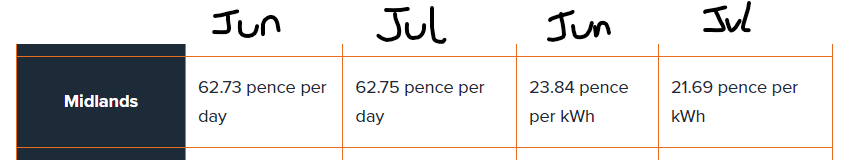 Those look like the current rates (Midlands), eg. the rates that came in on 01/07, there was no price change on 21/07 unless you were coming off a fix.james_smitha said:All right them, I'm happy to be educated. Where I live is near Leamington Spa in warwickshire.for Electrics I pay21.68p per kWh
