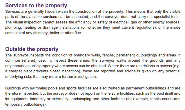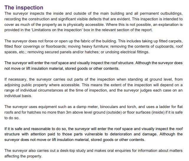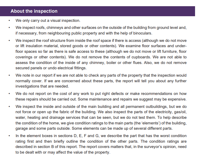 Visual inspection only, doesn't move any furniture, move any contents in cupboards or loft, doesn't lift insulation or carpets, doesn't test electrics, gas, plumbing, heating or drainage...