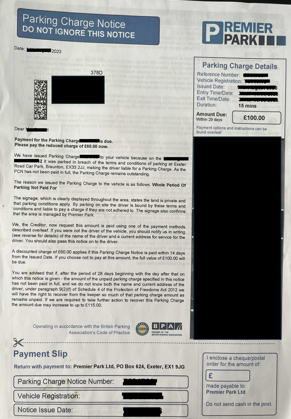 The car park in question is the Exeter Road Car Park in Braunton Devon operated by Premier Park Limited. We are not local and the car park is unfamiliar to us. I failed to make a £0.50 payment when I entered and stopped on the site to deal with a medical issue.