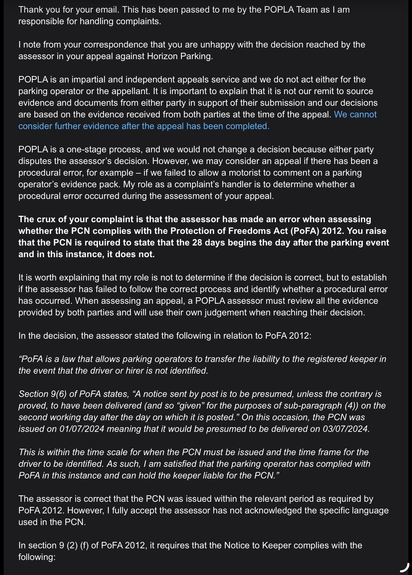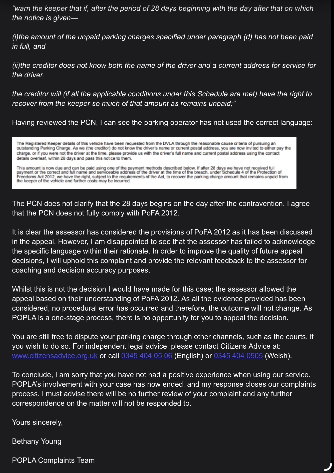 So basically the complaints team stated that the parking operator didn’t use the correct language and the Popla assessor failed to acknowledge that, but still they could not change the outcome of the appeal. How ridiculous is that?Anyway, I’ll keep you posted.0 -