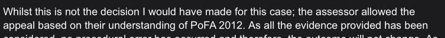 Hold on unless I am going daft, in this ridiculous fob off about being a one stage appeal even when we got it wrong, the complaints handler has made yet another error.Surely this is wrong also they are stating that the assessor "allowed the appeal":