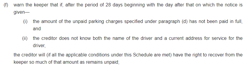 Para 9(f) requires the creditor to warn the keeper that the creditor will have the right to recover unpaid charges if they are not paid “after 28 days beginning with the day after that on which notice is given”