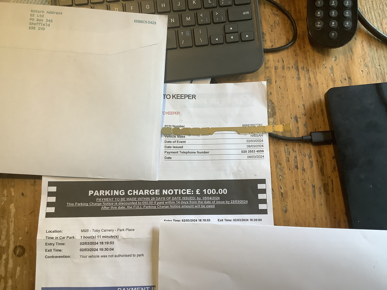 The back story is that I wasn’t the driver but I was the passenger. I made a mistake in entering the reg number (we have a second car and I put in the number for the other car). It was a Toby Carvery and we were bona fide customers. (I didn’t know until I’d already lodged my first appeal that you can usually get a reduction on the penalty if you explain this.)