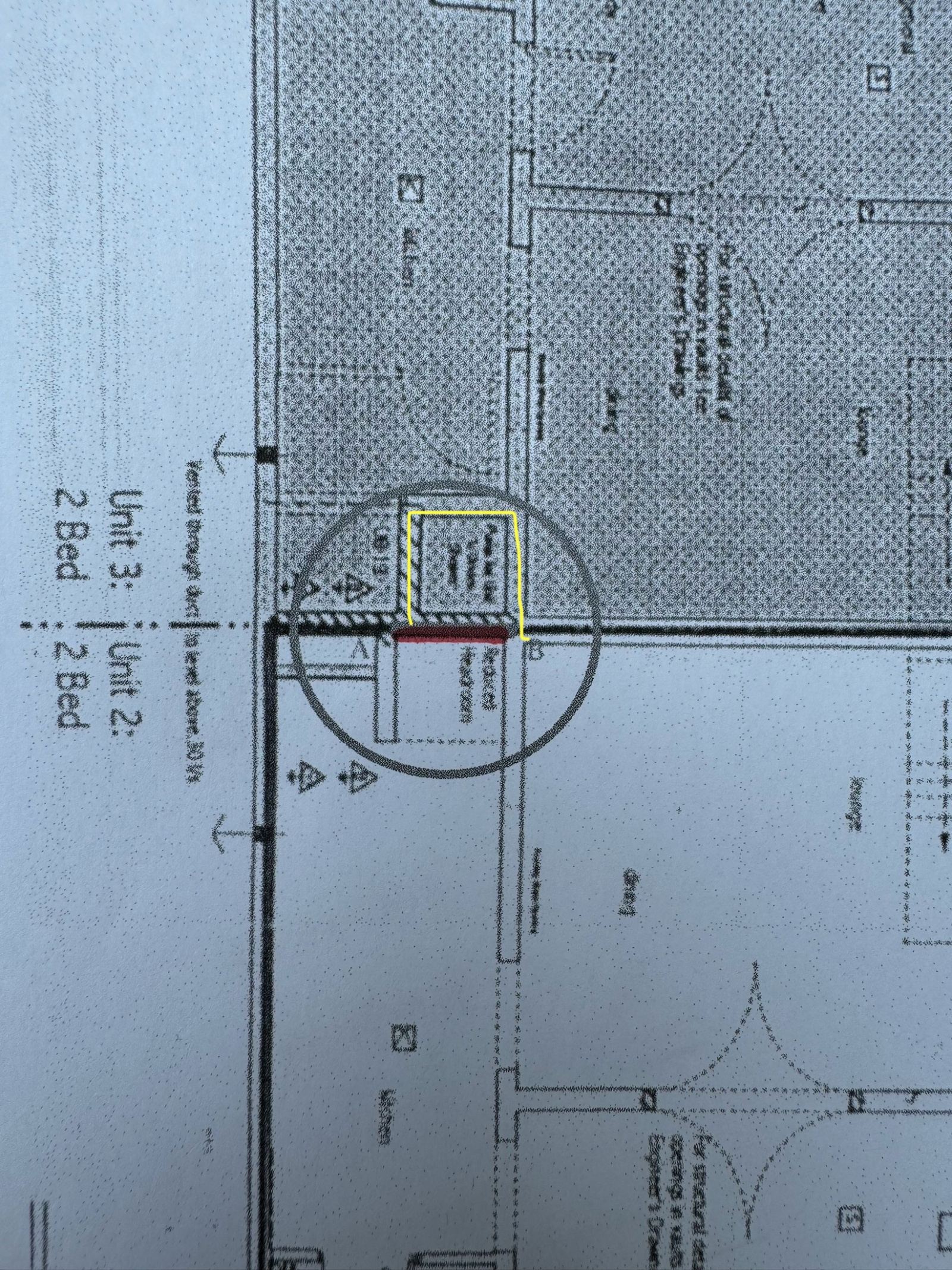 The bit in Yellow is the space in question that was incorrectly left as part of our flat, and the Red line is the newly built wall to block that off .