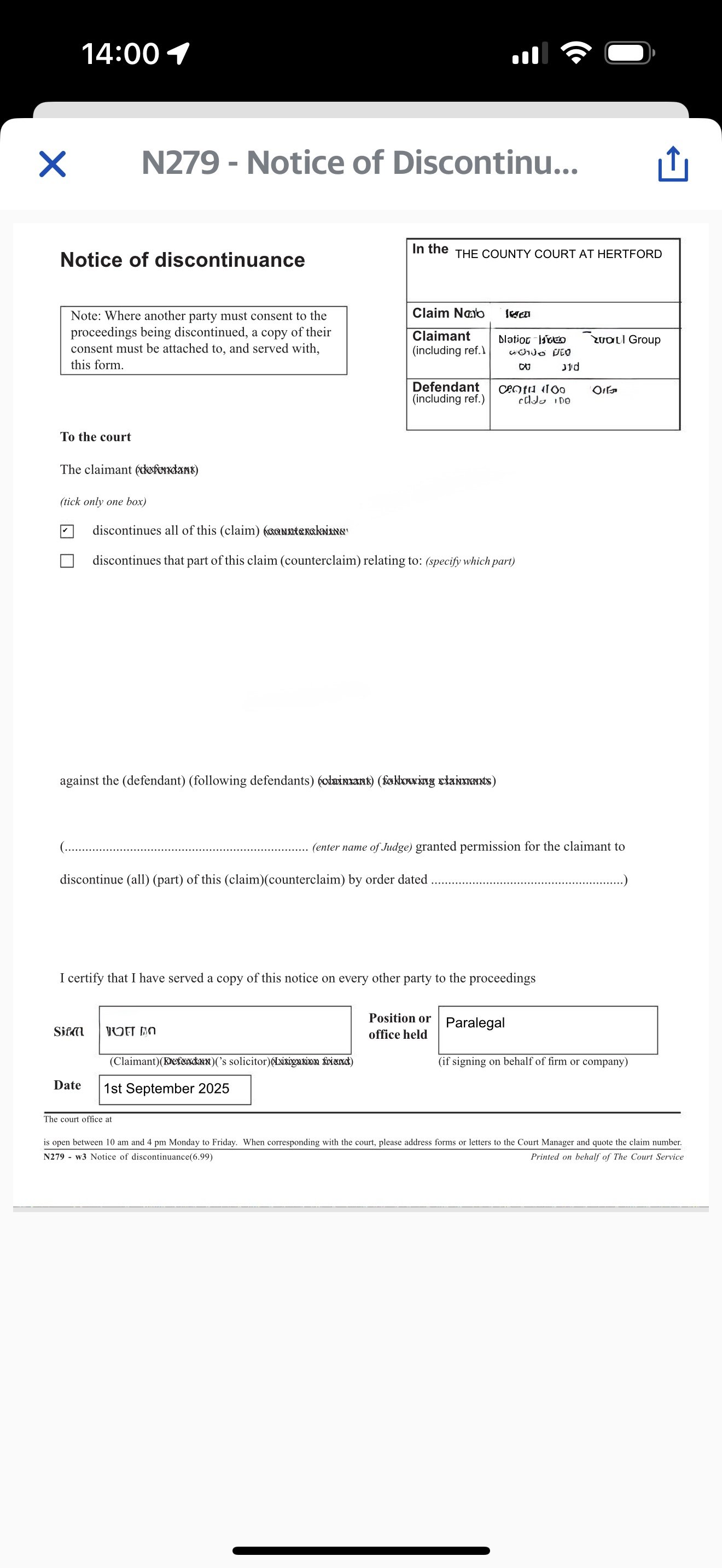 Well, here we go, that's discontinuance 666 - a devil of a good outcome. Memorable milestone.Thank you @CanineLover for the copy of your NoD. I can now get this counted in the DCBL Legal thread of shame. 👍Please note, we are not a legal advice forum. I personally don't get involved in critiquing court case Defences/Witness Statements, so unable to help on that front. Please don't ask. .