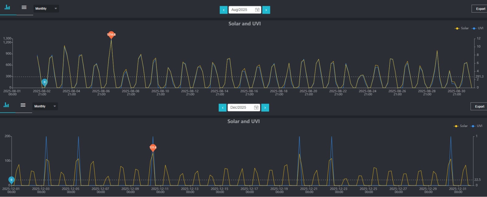 This is the solar irradiance measures I get in Watts per square m in August vs. Dec, there's close to factor of 10 difference from the peak in August compared to the peak in Dec.
